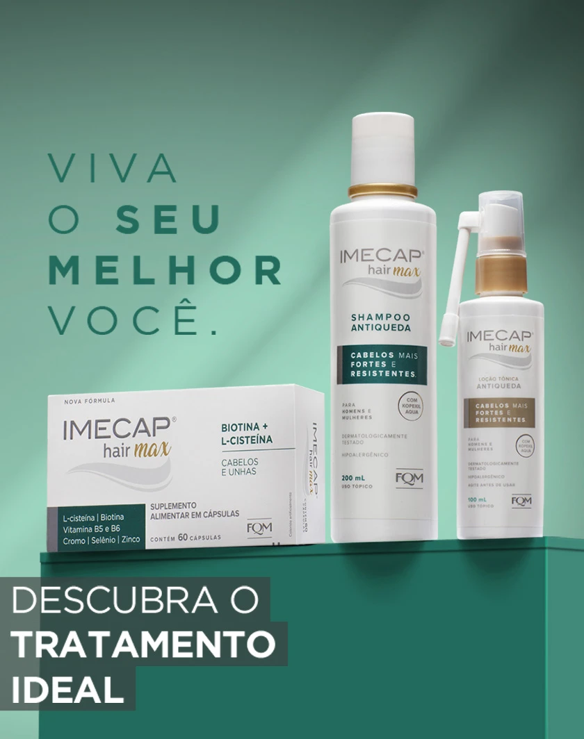 Uma boa estratégia para diminuir a queda de cabelo é utilizar Imecap® Hair Max Cápsulas diariamente. Com fórmula exclusiva composta por Biotina, Cisteína, Vitamina B5, L-Cistina, Vitamina B6, Cromo, Selênio, Zinco e Colágeno, essa vitamina para queda de cabelo e unhas fracas nutre os cabelos danificados, melhora a estrutura dos fios e reduz a queda capilar, além de melhorar a saúde e resistência das unhas.