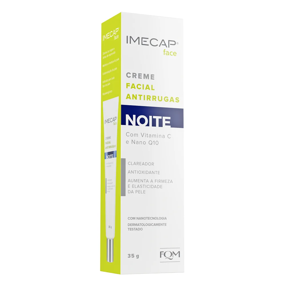 Imecap® Face Creme Noite é um creme antirrugas com vitamina C e Nano Q10, que diminui rugas e linhas de expressão e melhora a textura e uniformização da pele. Possui ação antioxidante, além de aumentar a firmeza e elasticidade da pele. É indicado para todo tipo de pele.